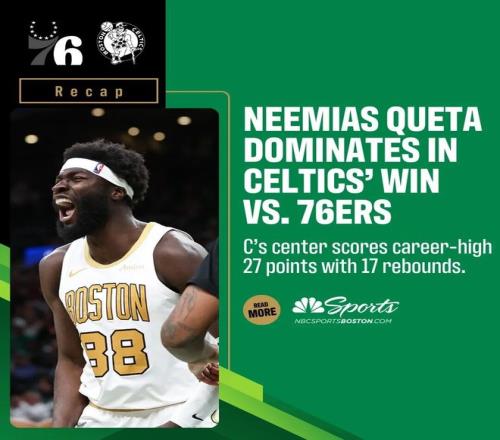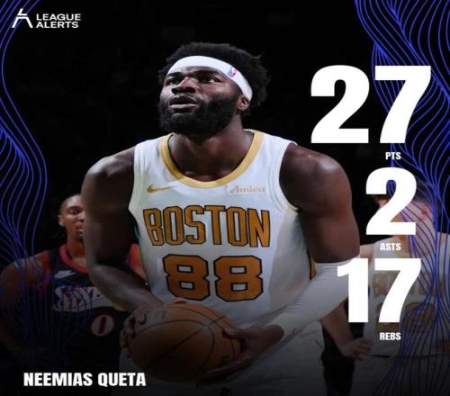这场比赛,凯尔特人的中锋内米亚斯克塔打出了生涯最强的一场比赛:全场出战27分钟,投篮14中10,罚球10中7,拿下27分17篮板2助攻3盖帽,正负值+20。